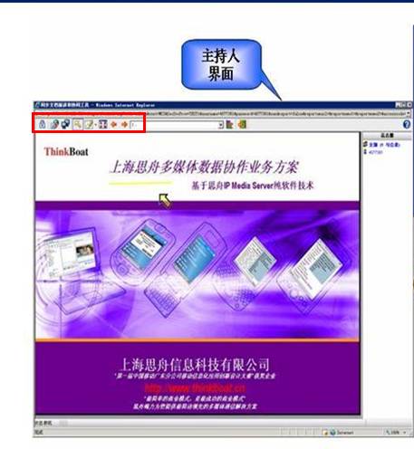 当我们在进行视频会议时,也可以进入WEBCOLLAB数据会议,进行界面的操作会议模式,更加直观的表达会议的主题,主持人可以完全的操作主界面,主持人也可以把权限切换给每位在场的会议人员,其他会议人员在会议进行时,同样可以进行举手,聊天