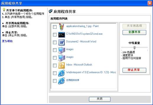 “共享”按钮允许演示者共享个人应用程序或整个桌面。 演示者选择 “共享”按钮后,对话框将显示正在运行的应用程序列表。